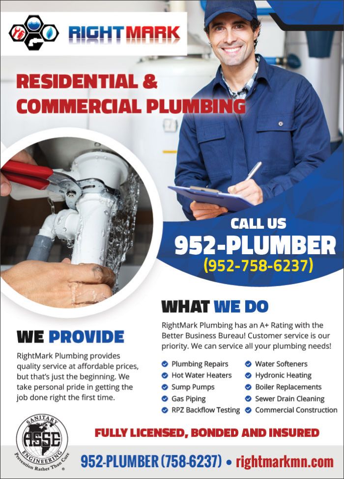 SERVICES: RPZ Backflow Testing, Plumbing Repairs, Hot Water Heaters (including Rinnai Tankless Water Heaters), Sump Pumps, Toilets & Faucets, Gas Piping, Water Softeners, Hydronic Heating, Boiler Replacements, Sewer Drain Cleaning, Commercial Construction